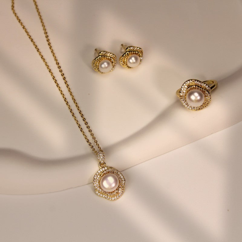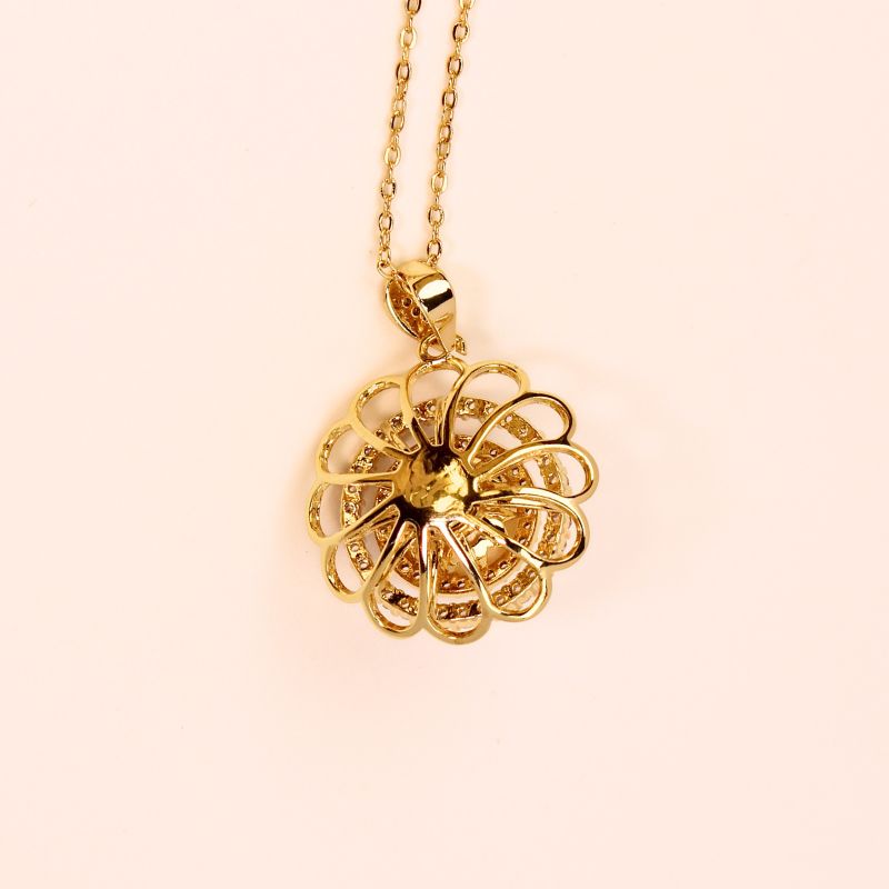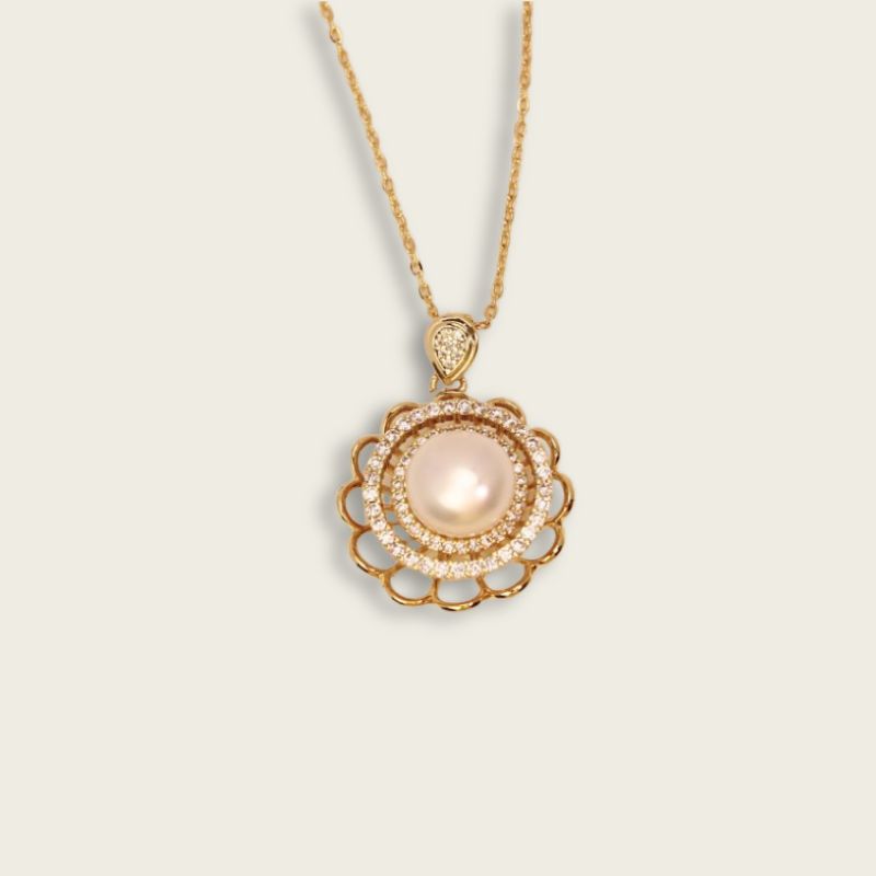 La perla redonda natural de agua dulce está rodeada por un círculo de diminutas circonitas brillantes, seguido de un círculo de circonitas giratorias en el exterior y se encuentran en el corazón de una rosa.